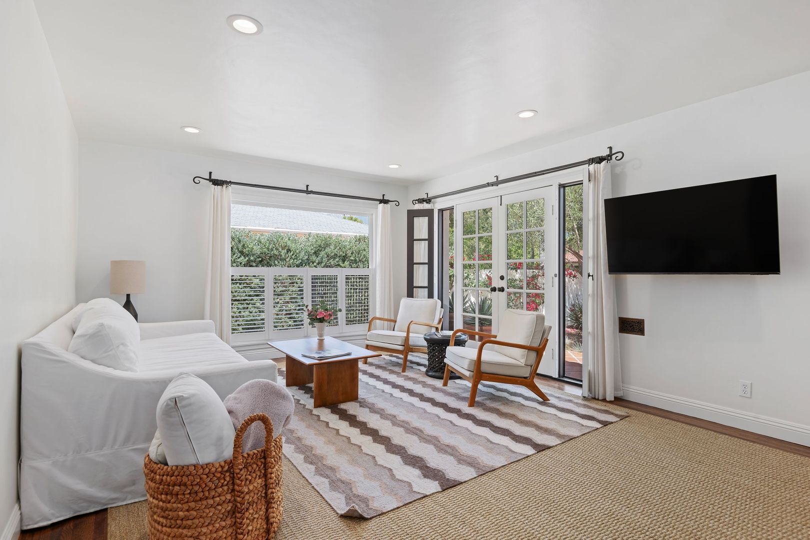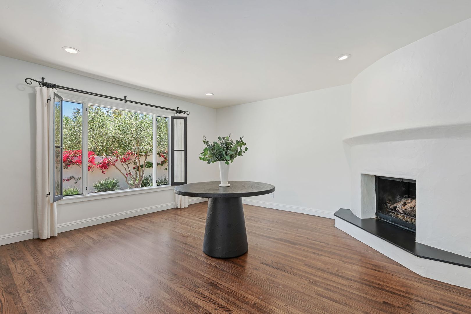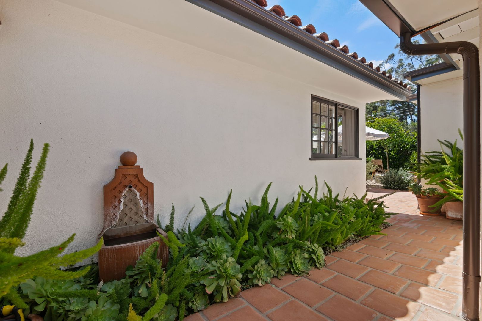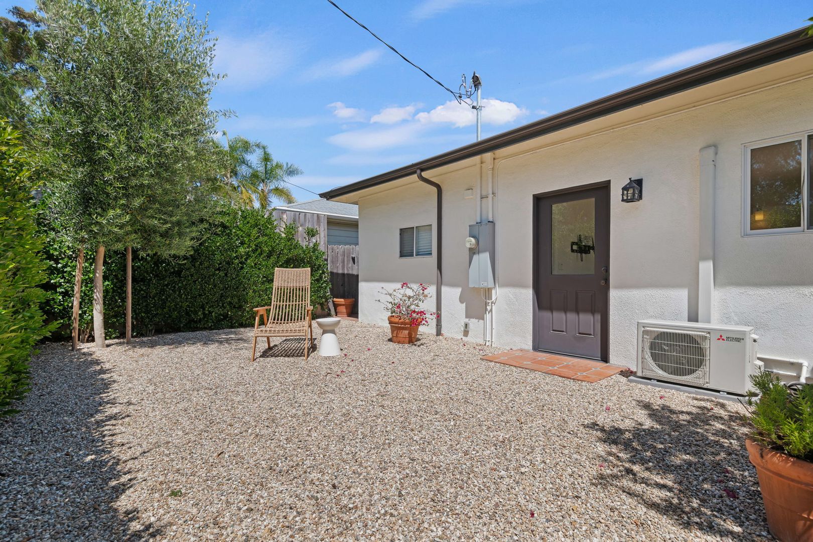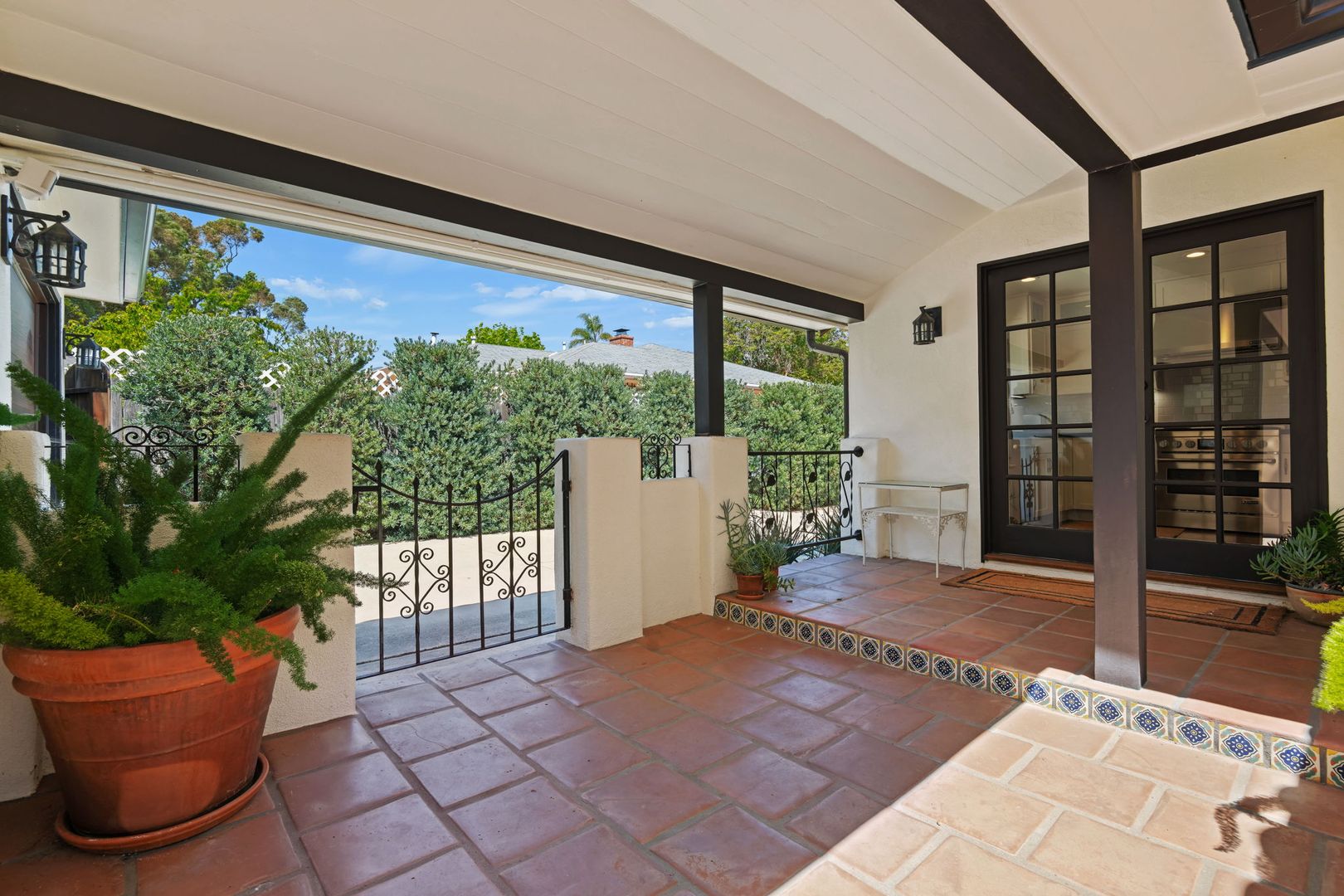 From the moment you arrive, the property makes a lasting impression. Lush, thoughtfully designed landscaping creates year-round beauty, with vibrant gardens and cascading bougainvillea complementing the crisp white stucco exterior. A handcrafted iron gate welcomes you into a private, walled courtyard—your own serene sanctuary.