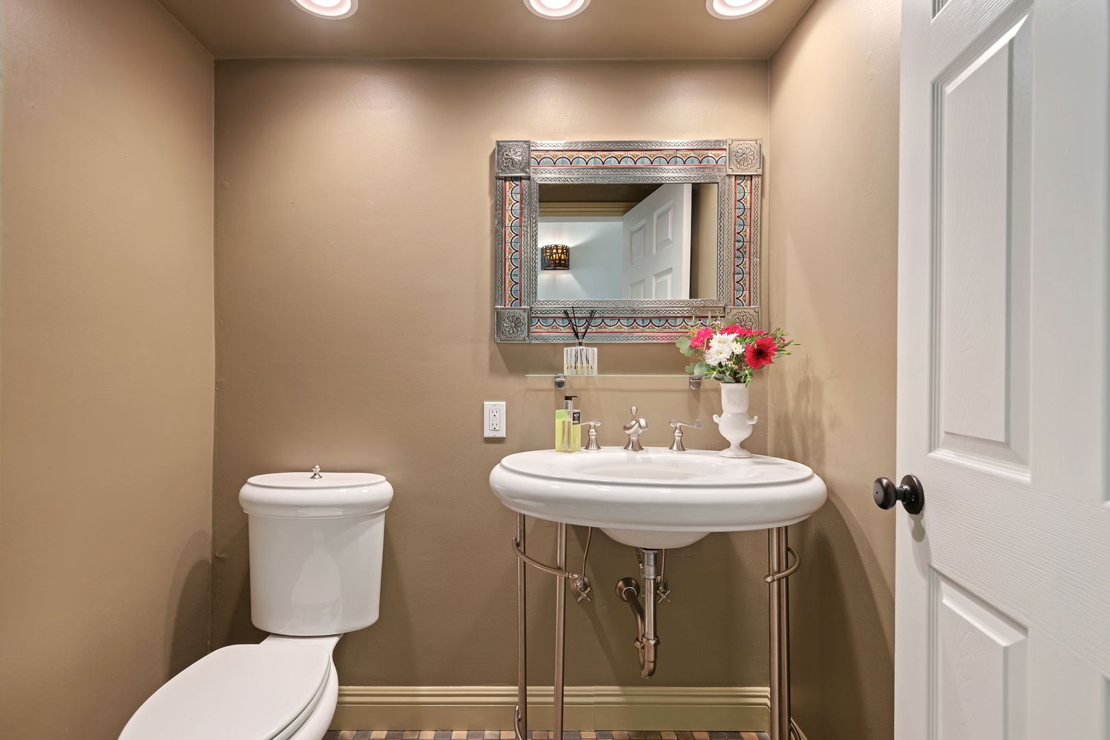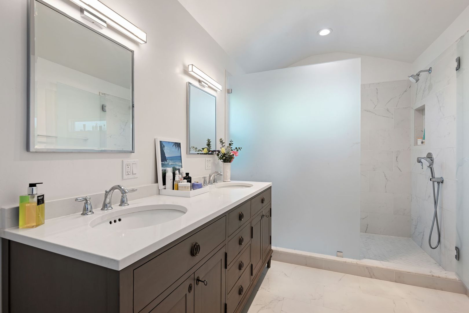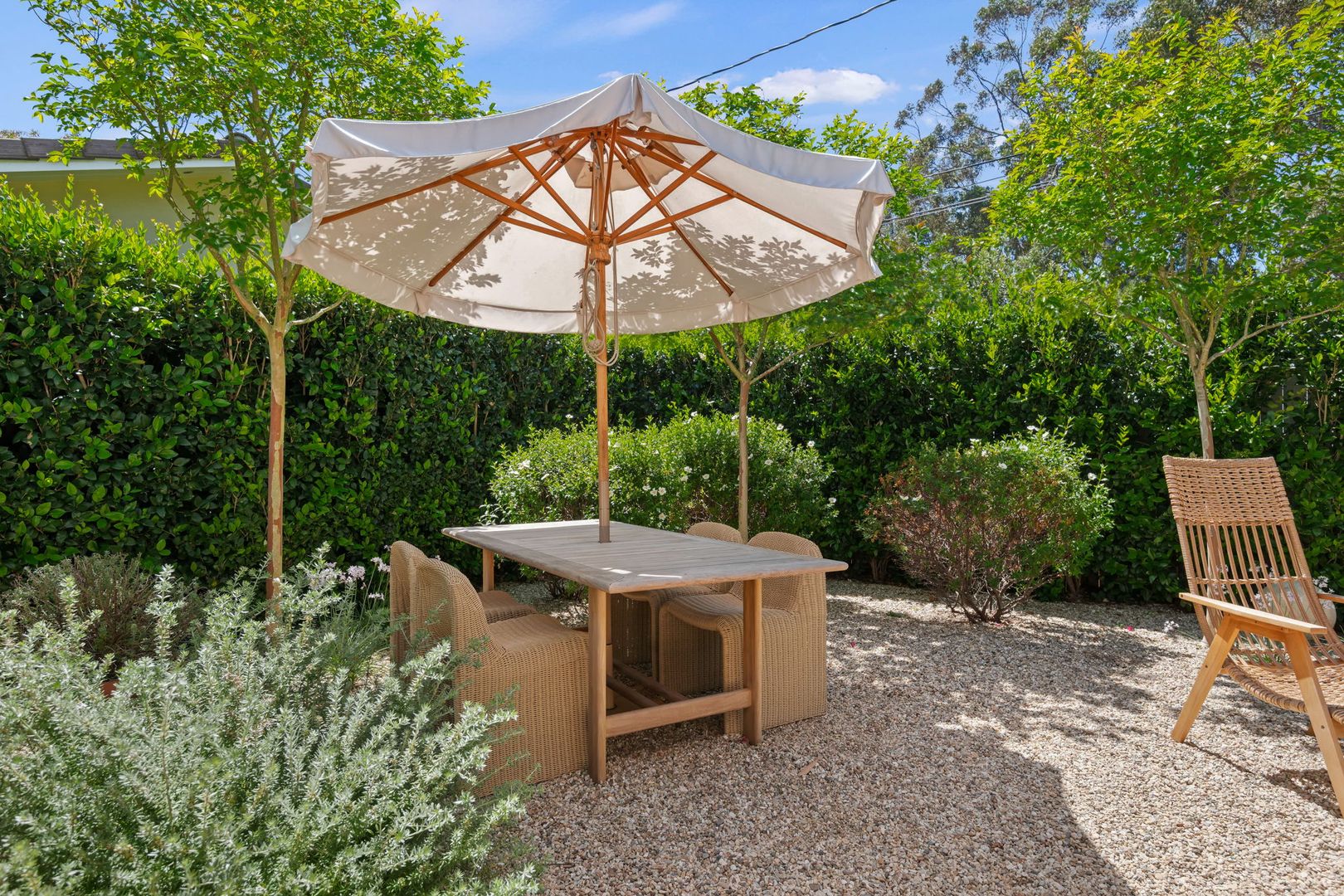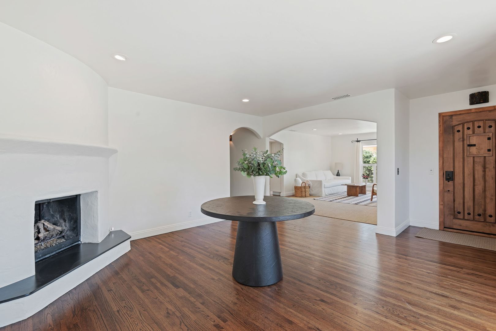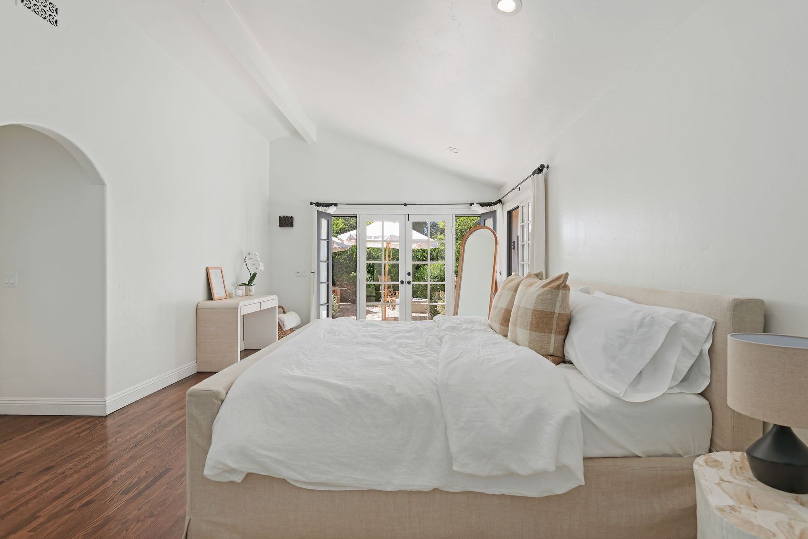 From the moment you arrive, the property makes a lasting impression. Lush, thoughtfully designed landscaping creates year-round beauty, with vibrant gardens and cascading bougainvillea complementing the crisp white stucco exterior. A handcrafted iron gate welcomes you into a private, walled courtyard—your own serene sanctuary.