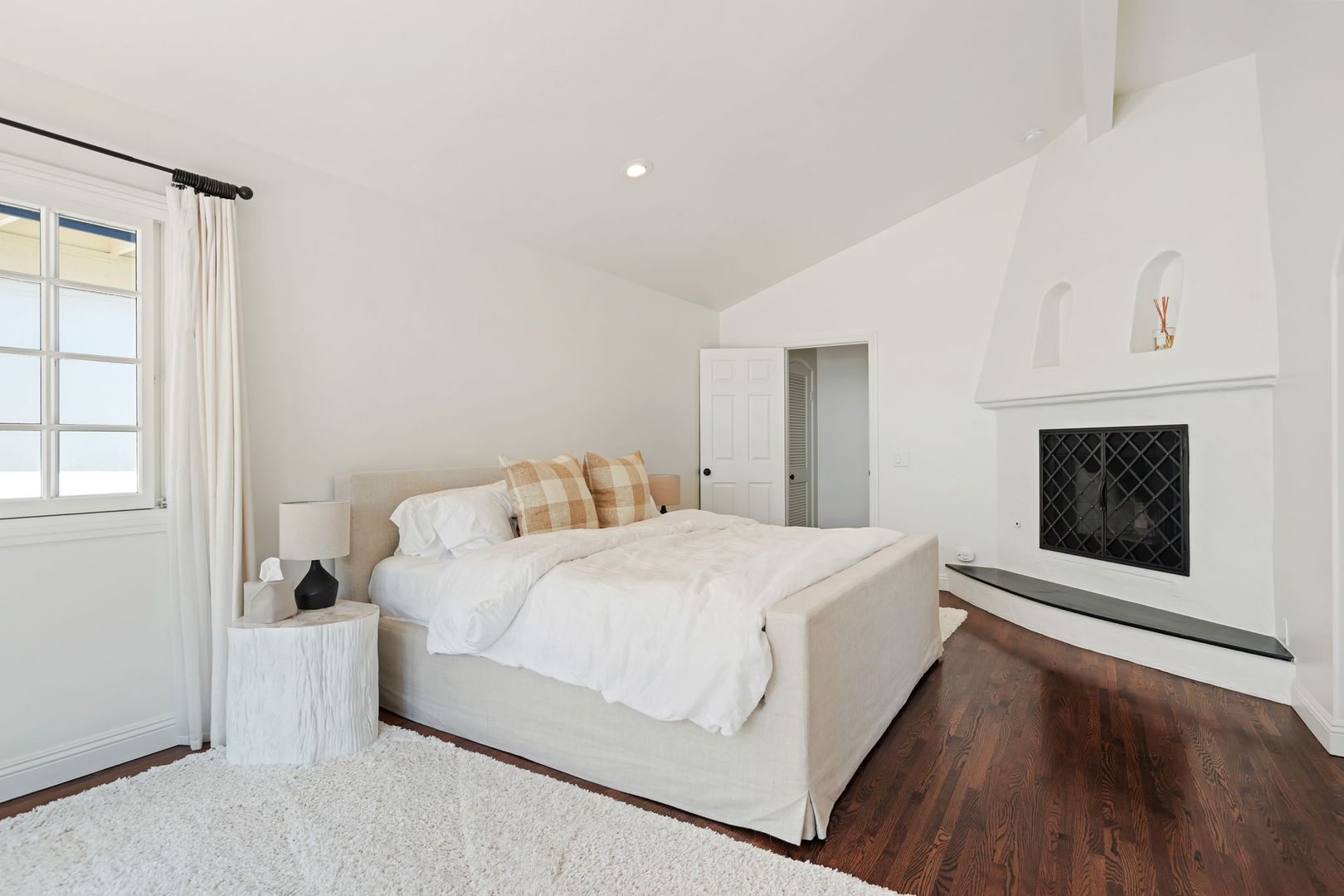 The main residence features two spacious bedrooms and two and a half bathrooms, highlighted by a luxurious primary suite with vaulted ceilings and a romantic fireplace.