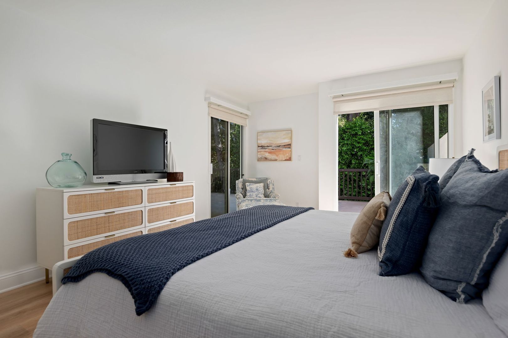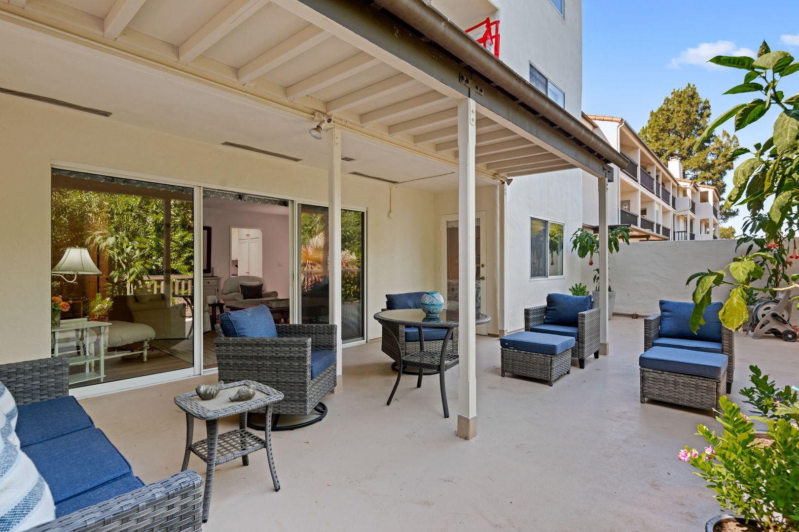 Tucked moments from the beach, this beautifully appointed 2-bedroom, 2-bath residence delivers a rare blend of refined luxury and effortless coastal living. Fully furnished with a designer’s eye, the 1,300 sq. ft. interior flows seamlessly into an extraordinary 1,600 sq. ft. private wraparound patio—creating a true indoor-outdoor sanctuary surrounded by lush greenery and mature trees.